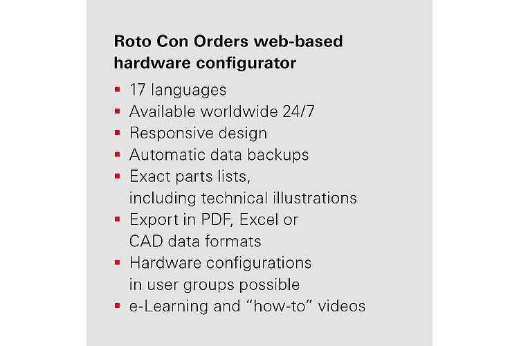 Leinfelden-Echterdingen – Roto Frank Fenster- und Türtechnologie GmbH is expanding its portfolio of digital learning services with an e-Learning tool specifically for the Roto Con Orders" hardware configurator. The free and user-friendly learning program gives users a practical introduction to using the configurator efficiently and how to fully utilise its added value.