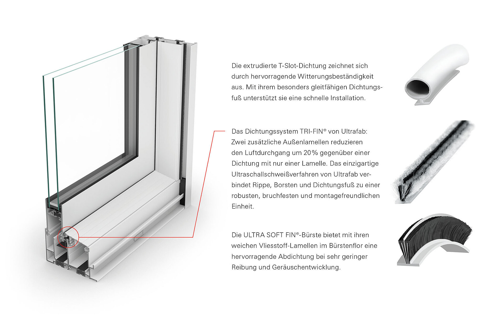 Für die Schiebetür Studio nutzt Novatech die Premiumbürstendichtung TRI-FIN® mit der ULTRA SOFT FIN®-Bürste für höchste Wind und Regendichtigkeit. Zwei Außen- und eine Mittellamelle reduzieren den Luftdurchgang um 20 % gegenüber einer Dichtung mit nur Einer Lamelle. Das einzigartige Ultraschallschweißverfahren von Ultrafab verbindet Rippe, Borsten und Dichtungsfuß zu einer robusten, bruchfesten und montagefreundlichen Einheit. Die Borsten können weder verkleben, noch brechen, noch außer Form geraten. Das ist wichtig für die Langlebigkeit, Qualität und zuverlässig hohe Dichtigkeit von Türen.