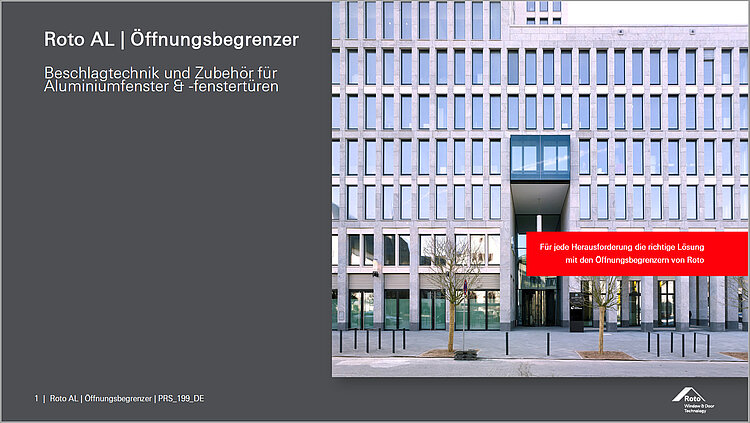 Leinfelden-Echterdingen – In immer mehr Leistungsverzeichnissen finden Hersteller von Aluminiumfenstern die Aufforderung, Fenster oder Lüftungsklappen mit einem geprüften Öffnungsbegrenzer zu liefern. Verarbeiter der bewährten Beschlagprogramme „Roto AL“ und „Roto AL Designo“ profitieren von einem stetig wachsenden Programm robuster Öffnungsbegrenzer, die auch für Fenster in öffentlichen Gebäuden bzw. in Räumen mit wechselnden Nutzern geeignet sind wie beispielsweise in Hotels und Krankenhäusern. Bereits die Begrenzer aus dem Standardprogramm sind für eine Vielzahl von Anwendungsfällen geeignet. Ab sofort ist im Medienportal der Roto Fenster- und Türtechnologie eine informative Präsentation zum Portfolio der Öffnungsbegrenzer verfügbar.