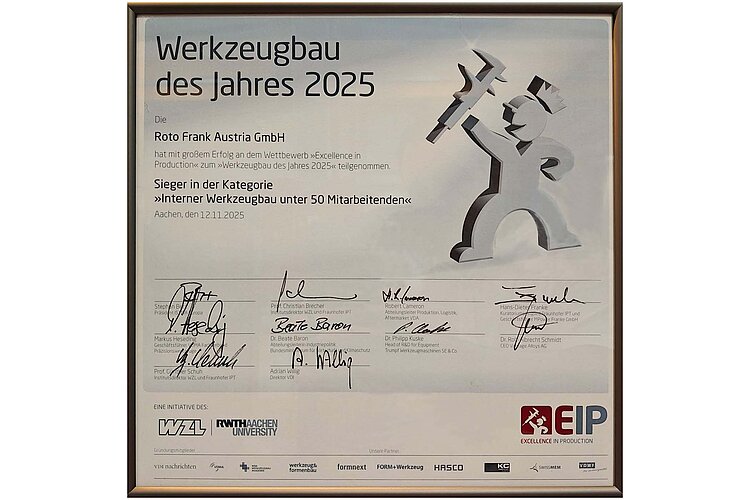 Die Auszeichnung „Excellence in Production“ (www.excellence-in-production.de) wurde in diesem Jahr zum 22. Mal vom Werkzeugmaschinenlabor der RWTH Aachen und dem Fraunhofer-Institut für Produktionstechnologie vergeben. Sie gilt als eine der wichtigsten Ehrungen für Werkzeug- und Formenbaubetriebe im deutschsprachigen Raum. Über 200 Unternehmen hatten sich in vier Kategorien zur Teilnahme angemeldet. Die Roto Frank Austria GmbH zählt mit ihrem Kategorie-Sieg nicht nur zu den Vorzeigebetrieben der österreichischen Industrie, sondern steht für Innovation und Qualität im Werkzeugbau.