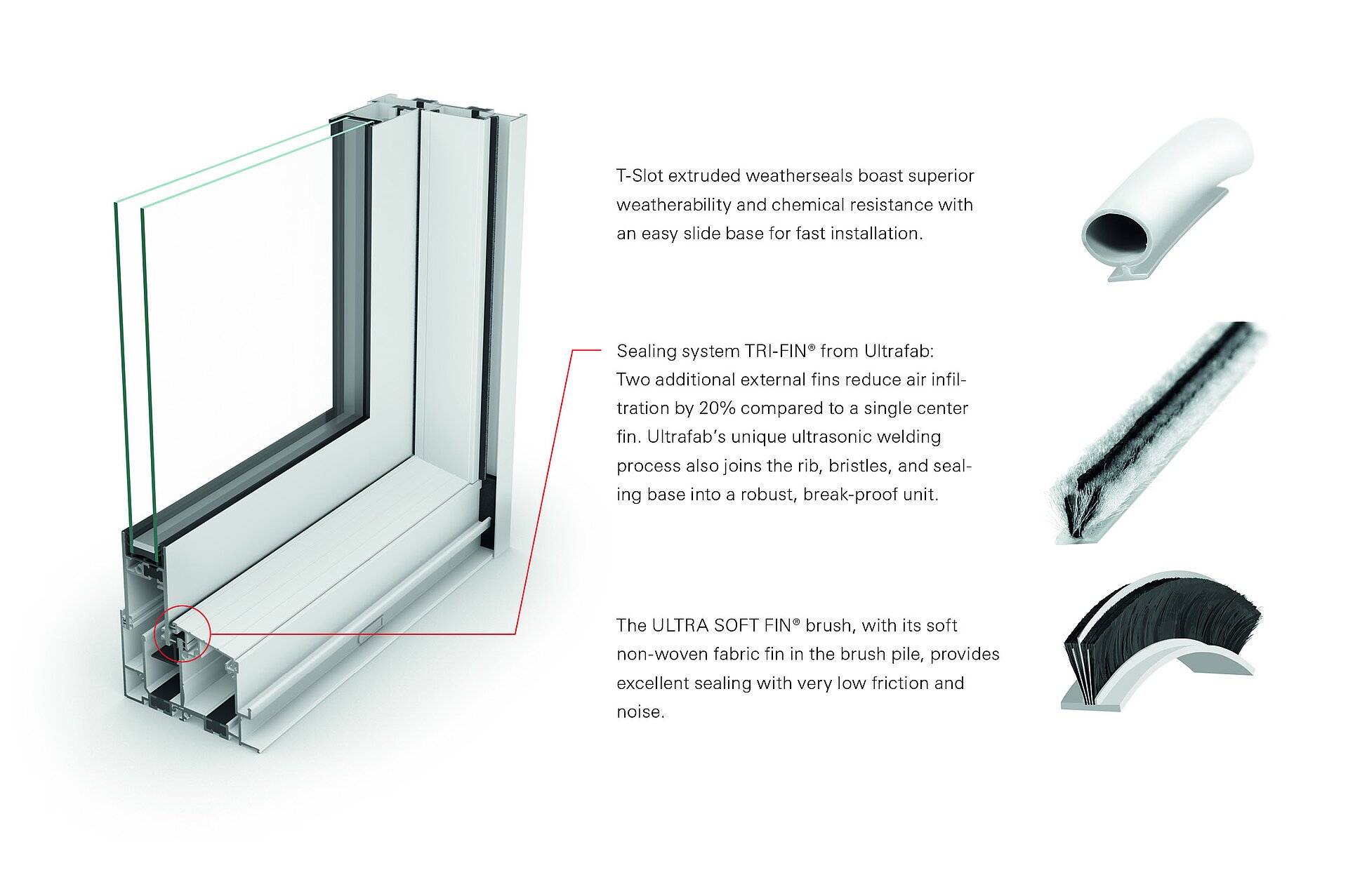 In their Studio sliding door, Novatech utilizes the high-performing TRI-FIN® brush seal with ULTRA SOFT FIN® for maximum wind and rain impermeability. The TRI-FIN® brush seal has two external fins and one center fin that reduces air infiltration by 20% compared to a single center fin. The dimensionally stable polypropylene gasket base simplifies installation, and Ultrafab’s unique ultrasonic welding process joins the rib, bristles, and sealing base into a robust, break-proof unit. The pile fibers remain intact, preventing sticking, breaking, or losing shape.