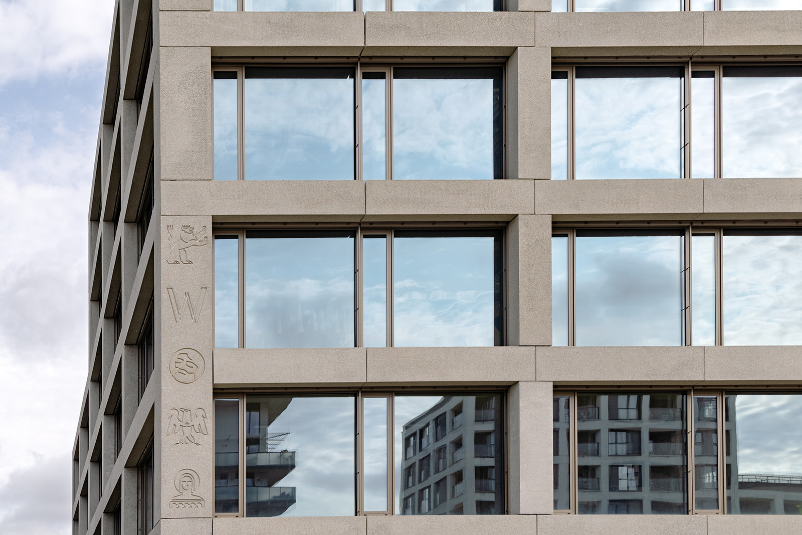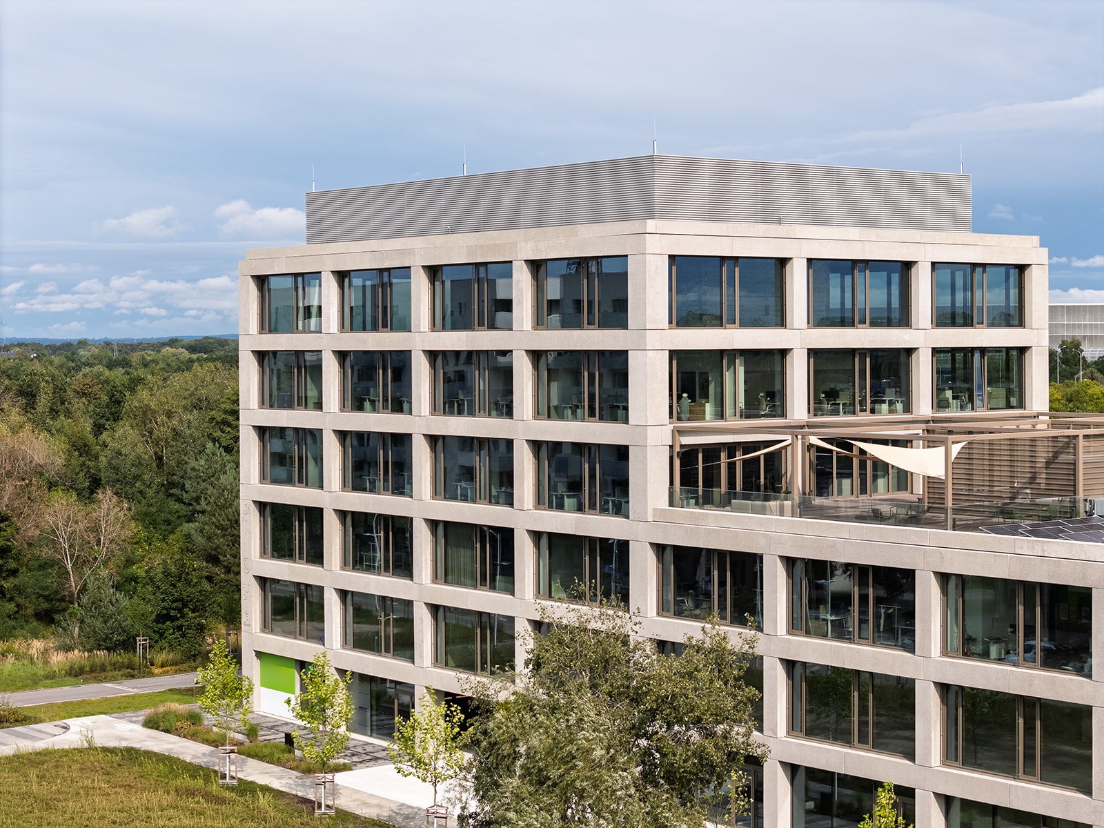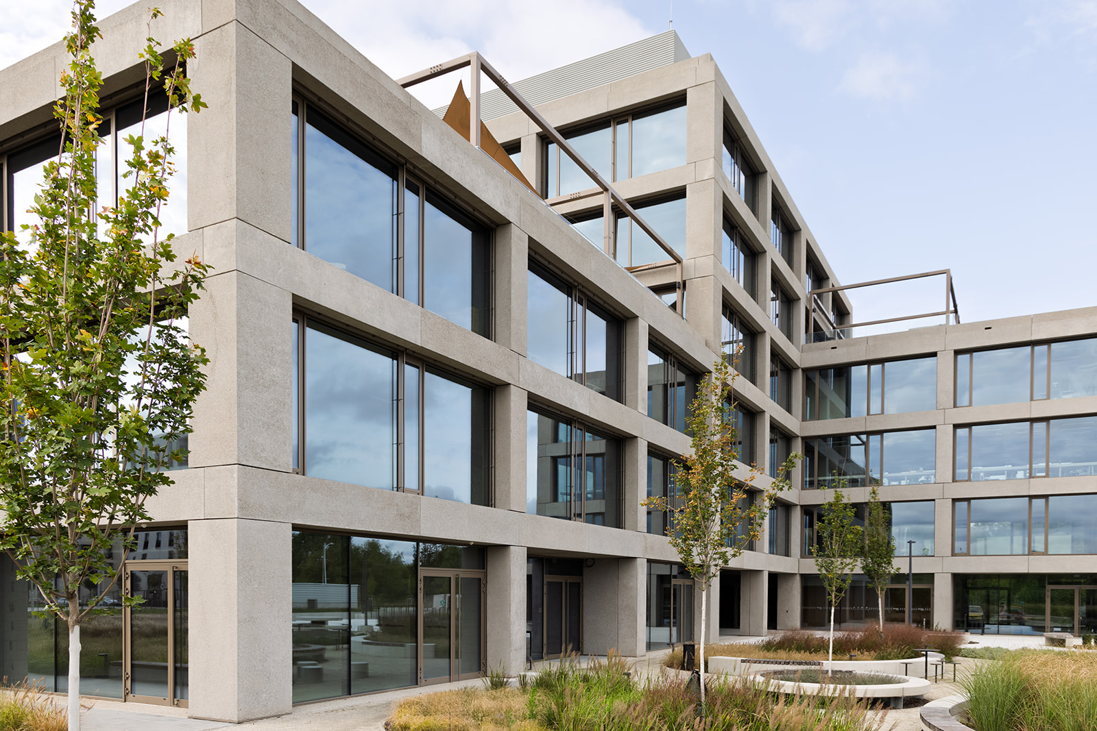 Architekturę obiektu kształtuje wyraźny, rytmiczny układ prefabrykowanych ram betonowych, które porządkują elewację i nadają jej modularny charakter. Jasny beton o subtelnej fakturze tworzy wyraziste obramowania dla dużych przeszkleń, podkreślając geometrię bryły.