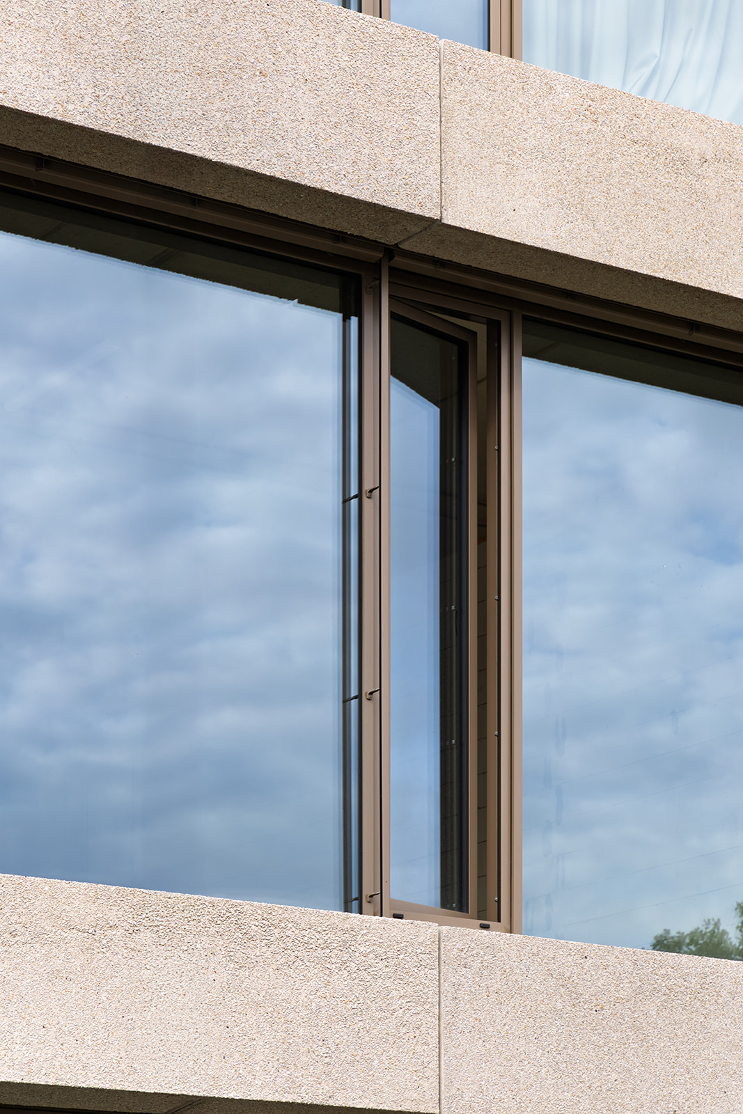 Charakterystycznym elementem są wąskie okna uchylne wykonane w systemie Roto AL Designo. Zaawansowana technologia ukrytych okuć pozwoliła na stworzenie bardzo wysokich, a jednocześnie wąskich skrzydeł rozwierno-uchylnych. Skrzydła okienne o wysokości 2949 mm i 765 mm szerokości. wkomponowane zostały pomiędzy duże moduły przeszkleń. Umożliwiają skuteczną wymianę i dostęp świeżego powietrza bez zaburzania rytmu elewacji. Klamka umieszczona z boku skrzydła pozwala na wygodną obsługę. Dzięki temu użytkownicy zyskują możliwość naturalnej wentylacji przy zachowaniu bezpieczeństwa i komfortu.