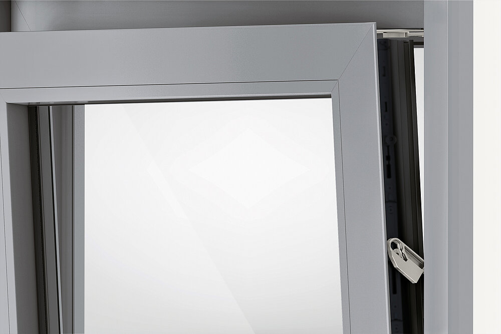 Pomimo dodatkowych punktów ryglowania, obsługa okna antywłamaniowego z funkcją TiltSafe jest równie łatwa, jak okna bez TiltSafe. Praktyczne na co dzień: zaczep montowany pionowo po stronie zasuwnicy wyposażony jest w funkcję stabilizacyjną. Zapobiega ona przymykaniu się uchylonego skrzydła – to dodatkowa korzyść, którą cenią sobie użytkownicy.