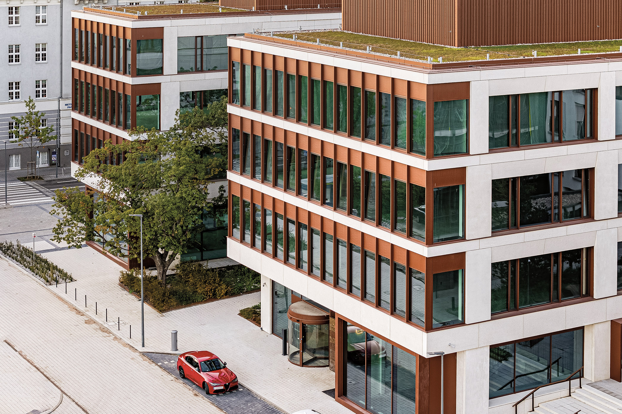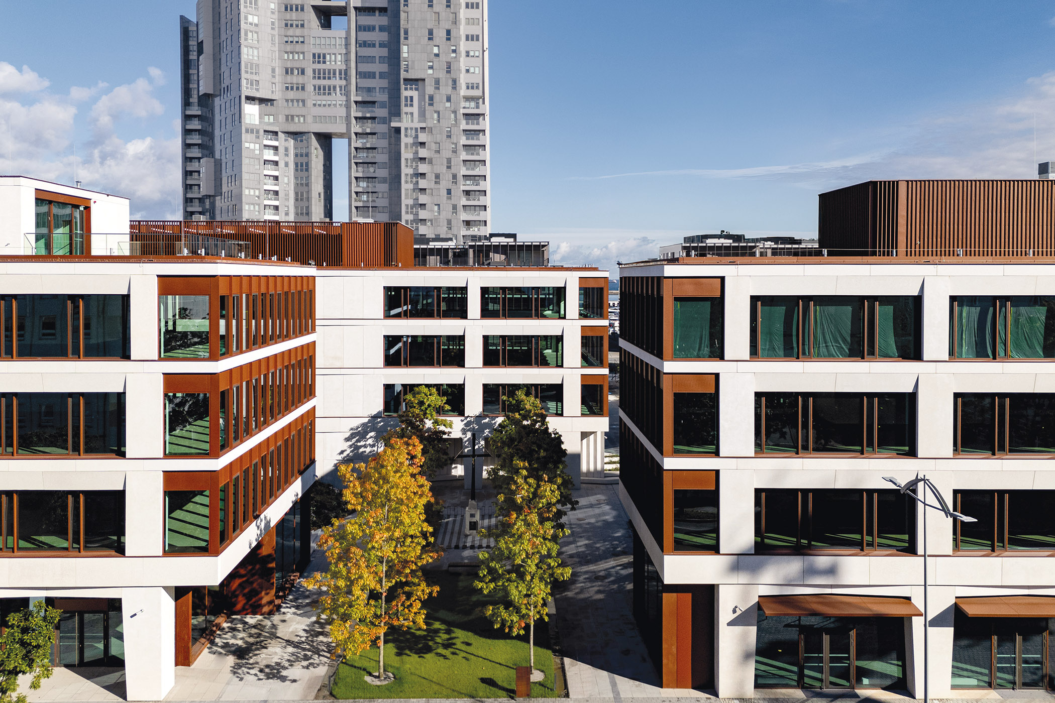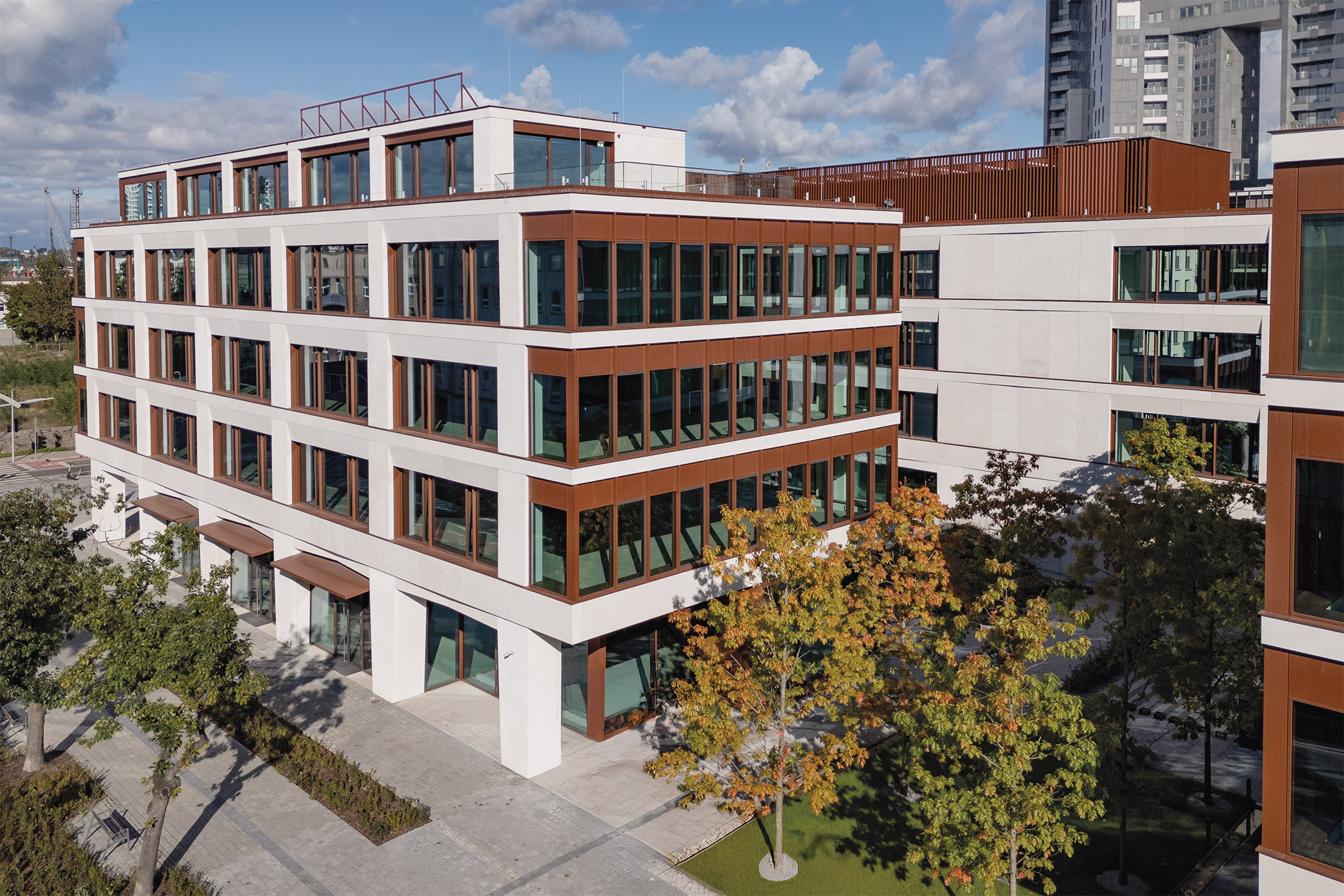 Within the development, in addition to offices and apartments, there are retail and catering establishments, conference space, a hotel, spa and public facilities, including a cinema. The arcades with a public square, green spaces and landscaping elements are also an important element of the complex.
