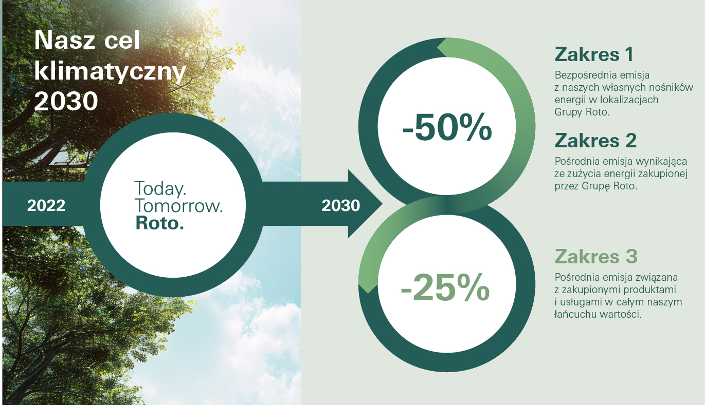 Grupa Roto wyznaczyła sobie cel klimatyczny: do 2030 roku zredukujemy emisję gazów cieplarnianych o 50% w zakresach 1 i 2 w porównaniu z rokiem bazowym 2022, w całej Grupie i na całym świecie. Dotyczy to całego naszego zapotrzebowania na energię, którą sami generujemy w naszych zakładach lub pozyskujemy od producentów energii. W zakresie 3, który obejmuje emisje gazów cieplarnianych z naszego łańcucha wartości upstream i downstream dążymy do redukcji o 25%.